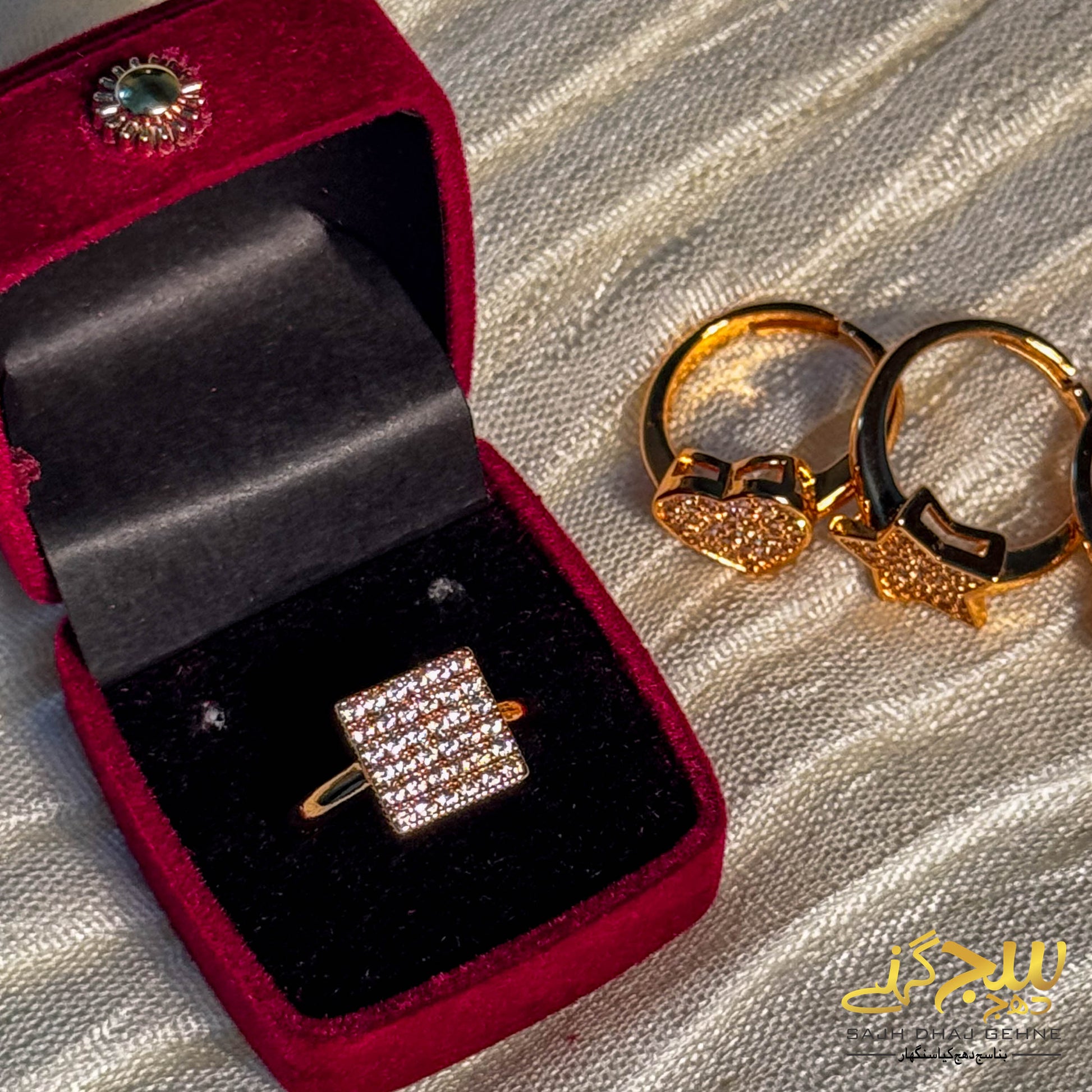 Modern and striking, this square-shaped ring combines the richness of gold with the sleekness of silver, studded for extra brilliance. A bold statement piece with timeless edge.