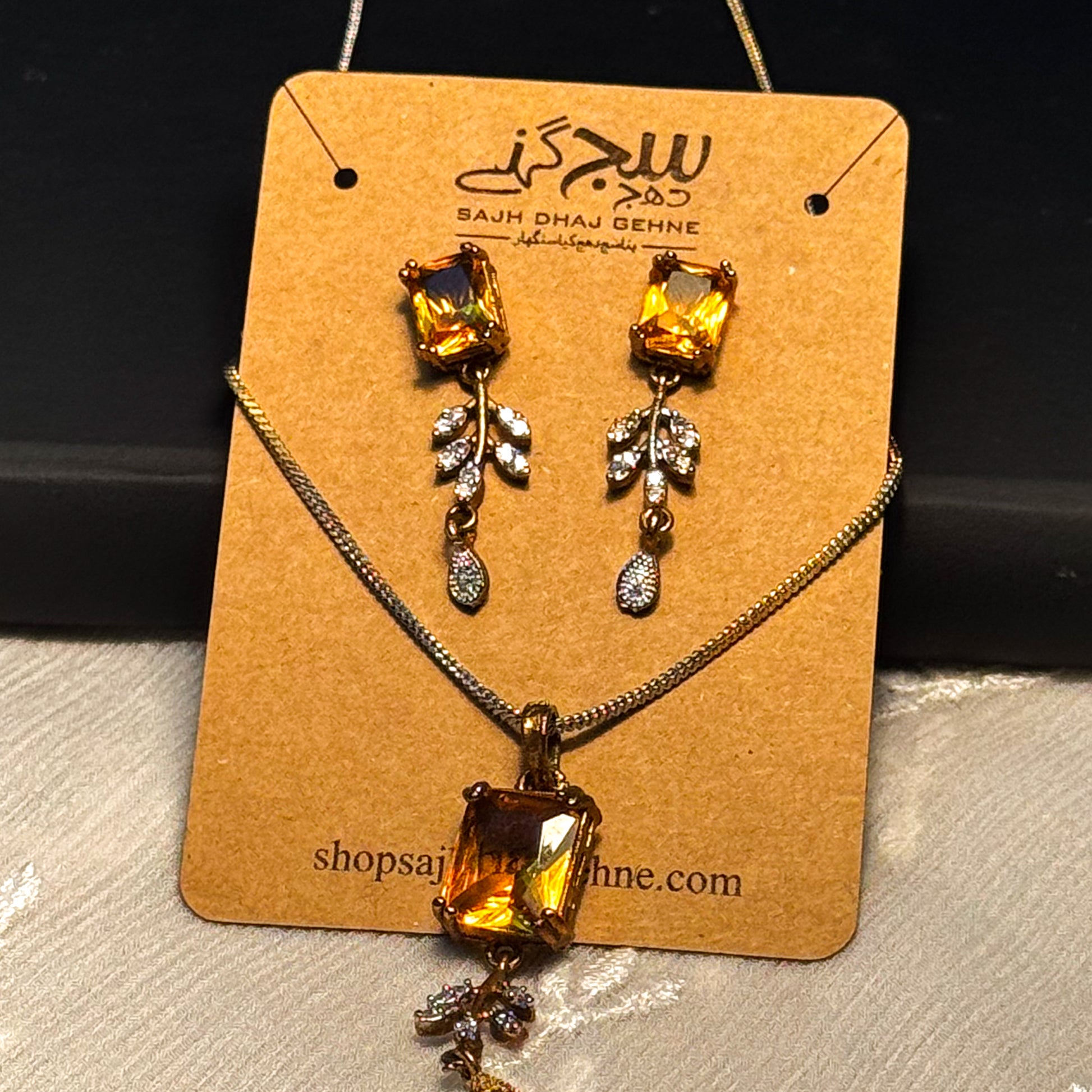 Modern meets majestic in this square-shaped gold necklace and earring set, adorned with golden crystals. A bold, geometric design that adds a touch of brilliance to every occasion.