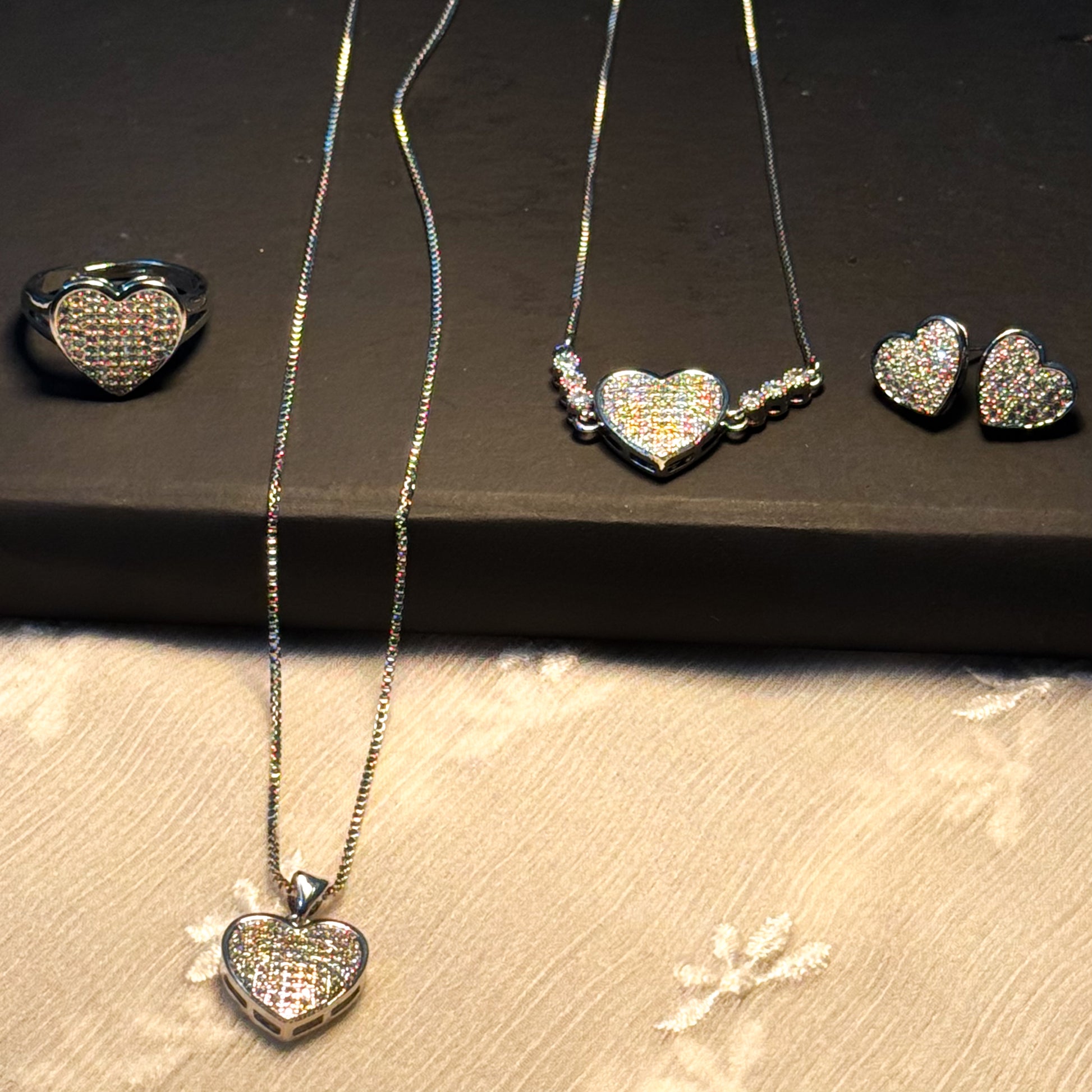 This radiant heart-themed silver plated set features a dazzling necklace, bracelet, ring, and earrings tops that put on a dazzling multicolor display. They are a perfect gift of sparkle for someone special—or yourself.